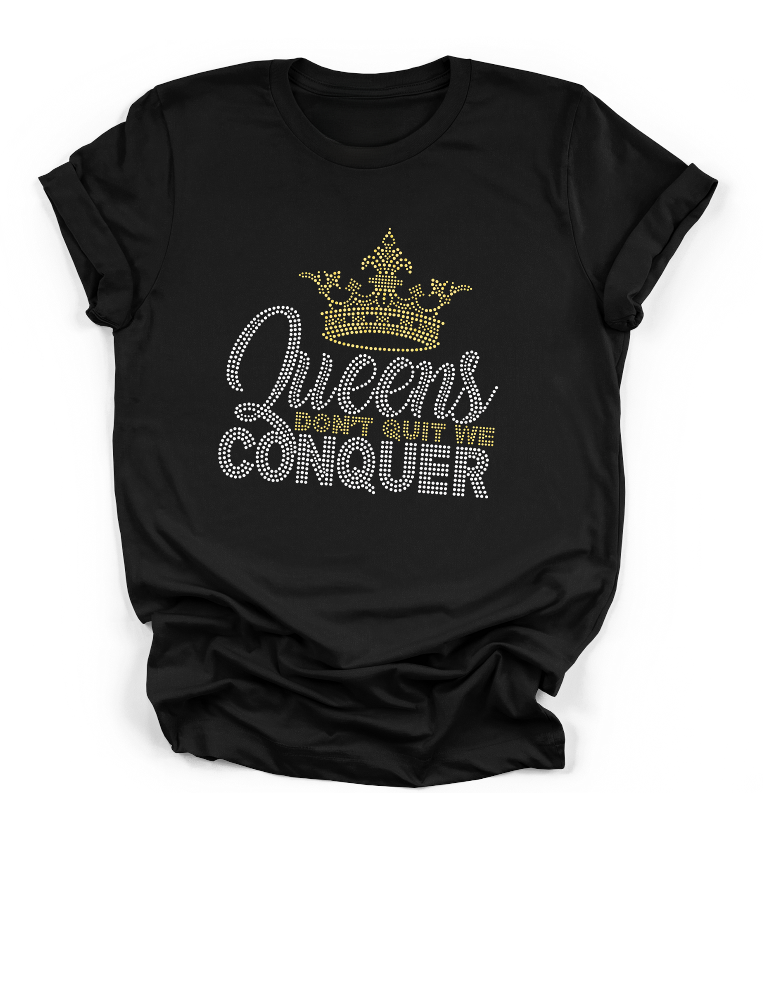 Slay in comfort and power with this 100% cotton women's tee, featuring the bold mantra, Queen's Don't Quit We Conquer. Soft, stylish, and unstoppable-just like you.